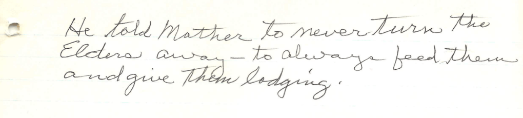 “He told Mother to never turn the elders away – to always feed them and give them lodging.” [Doris Russell writing about her mother, Martha Russell]