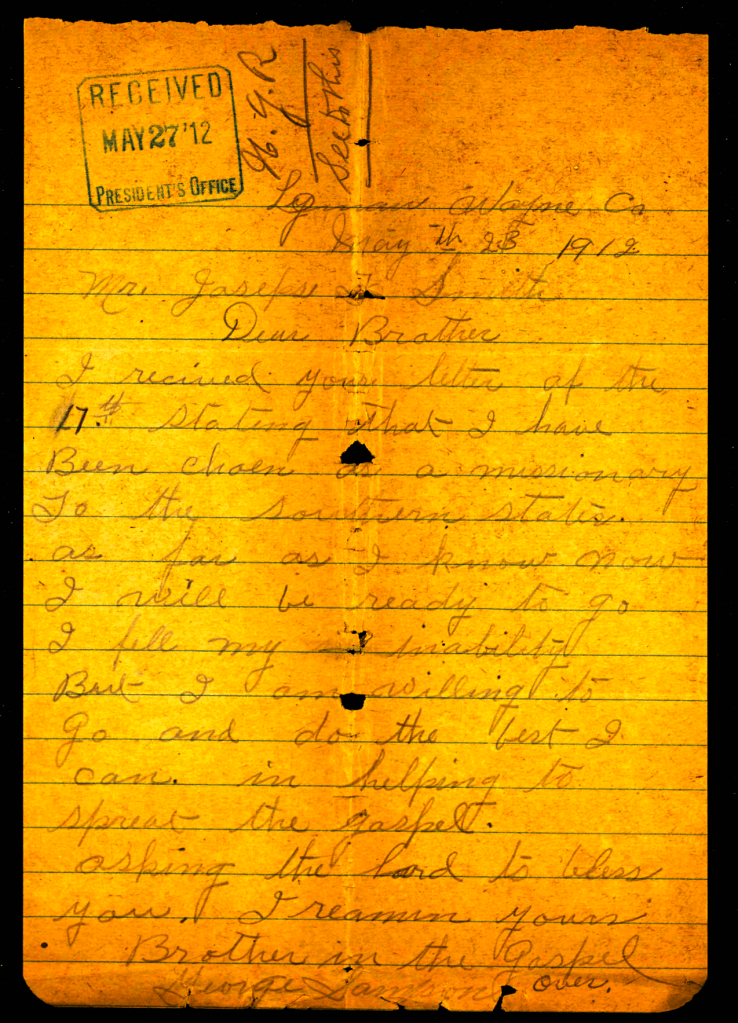 I received your letter of the 17th, stating that I have been cho[s]en as a missionary to the Southern States. As far as I know now I will be ready to go. I fill (sic) my inability by I am willing to go and do the best I can in helping to spread the gospel. Asking the Lord to bless you. I [illegible] yours. Brother in the gospel.
