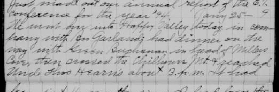 [Friday] – 25 January [1895] We went over into Happy Valley today in company with Bro[ther Joseph John Calvin (JC)] Garland. Had dinner on the way with Green Buchanan in head of Millers Cove, then crossed the Chilhowee Mountain, reached Uncle Thomas Hear[o]n‘s about 3 PM. It had been just 16 months since I had been there or seen them, but they knew me “on sight” and said they would know my hide in the tan yard or could tell my voice in the dark. Bless their good kind hearts, what a pity they do not get initiated into the fold of Christ that they may be fully rewarded for their many acts of kindness to our elders. We had a grand conversation until a late hour.