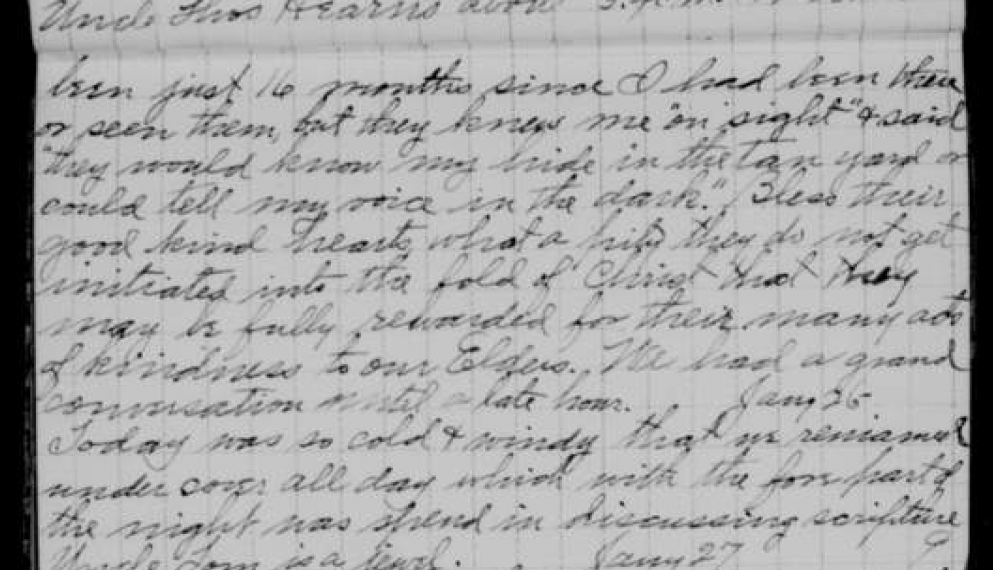 [Saturday] – 26 January [1895] Today was so cold and windy that we remained under cover all day, which with the forepart of the night was spent in discussing scripture. Uncle Tom [Hearon] is a jewel.
