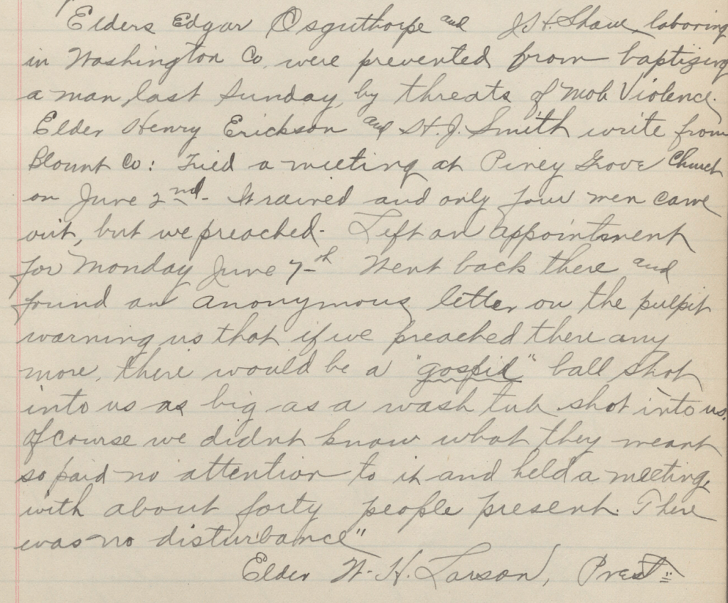 Elder [George] Henry Erickson and H[eber] J[ohn] Smith write from Blount Co[unty]: Held a meeting at Pine Grove Church on June 2nd, it rained and only [a] few men came out, but we preached. Left an appointment for Monday, June 7th. Went back there and found an anonymous letter on the pulpit warning us that if we preached there any more, there would be a “gospel” ball shot into us, as big as a wash tub shot into us. Of course, we didn’t know what they meant, so we paid no attention to it and held a meeting with about forty people present. There was no disturbance.