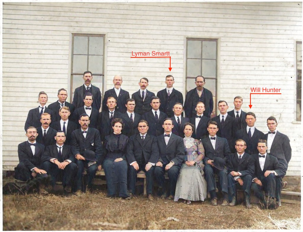 The irony: In this photo taken in 1909, Elder William Hunter is standing near Lyman Smartt whose future daughter, Eva Smartt, would marry, in 1946, the future son, Leroy Russell, of the man, Charles Russell, whom Elder William Hunter had baptized a few weeks before this photo was taken.