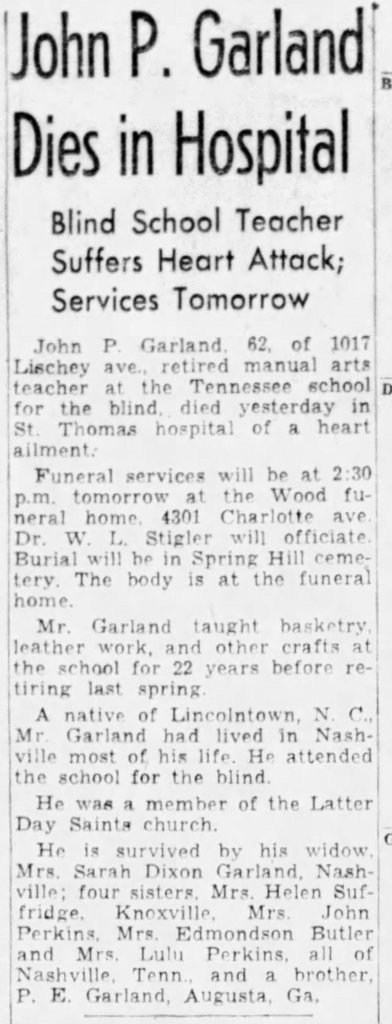 8. JP Garland was baptized in Millers Cove, in 1898, before being sent to a special school in Nashville. What special challenge did he work with throughout his life and what church does his obituary say he was a member of? What do you imagine is the first thing JP Garland saw on the other side of the veil?