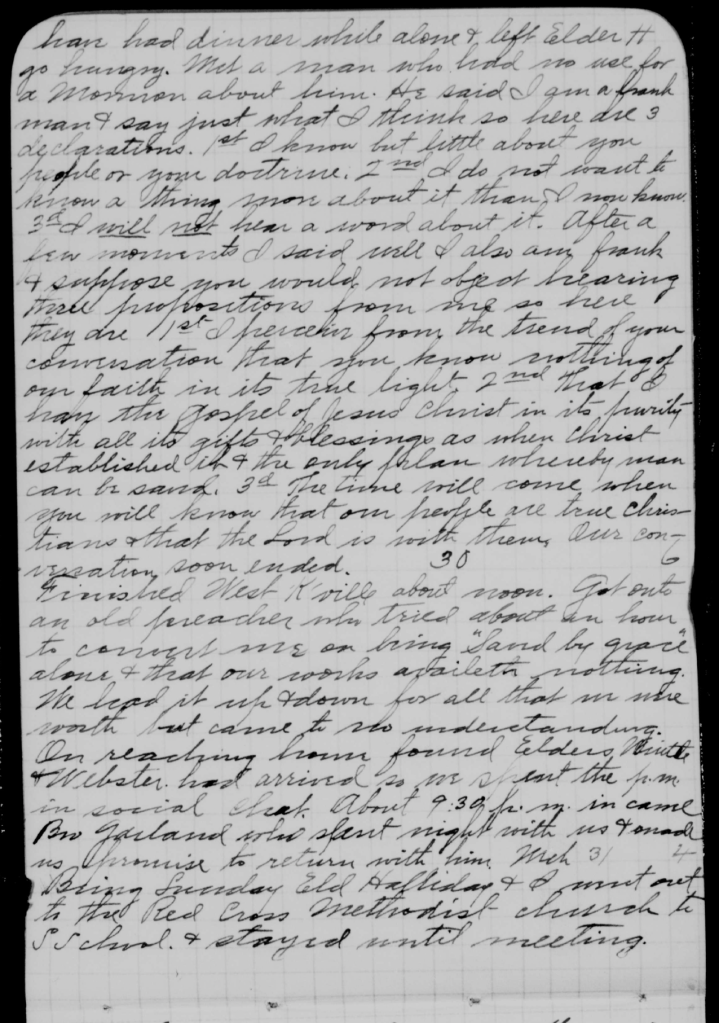 [Saturday] – 30 March [1895] Finished West K[nox]ville [at] about noon. Got onto an old preacher who tried about an hour to convert me on being “saved by grace” alone and that our works availeth nothing. We lead it up and down for all that we were worth but came to no understanding. On reaching home, [we] found Elders [George Barlow] Wintle and [John William] Webster had arrived, so we spent the PM in social chat. [At] about 9:30 PM, in came Bro[ther Joseph John Calvin (JC)] Garland who spent the night with us and made us promise to return with him.