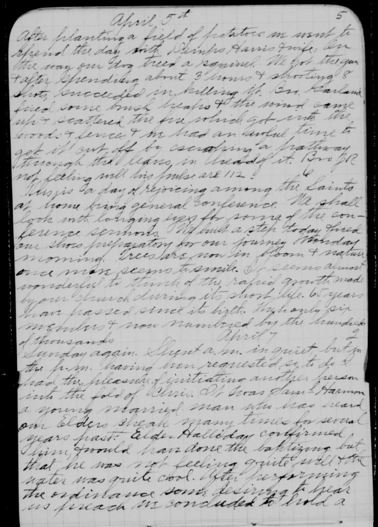 [Friday] – 5 April [1895] After planting a field of potatoes, we went to spend the day with [Nathan] Dempsey Harris and [his] wife, [Sarah Margaret Woody]. On our way, our dog treed a squirrel. We got the gun and, after spending about 3 hours and shooting 8 shots, succeeded in killing it. Bro[ther Joseph John Calvin (JC)] Garland fired some brush heaps and the wind came up and scattered the fire which got into the woods and fences, and we had an awful time to get it cut off by creating a pathway through the leaves in head of it. Brother J[ohn] R[oland Halliday is] not feeling well. His pulses (sic) are 112.