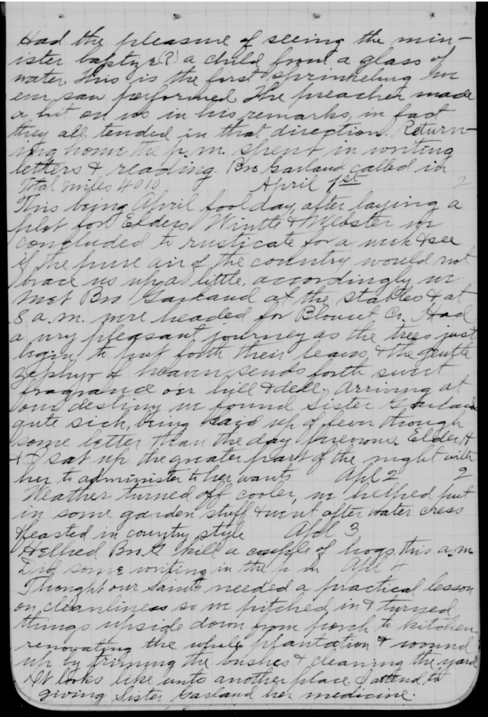 [Monday] – 1 April [1895] This being April fool day, after laying a plot for Elders [George Barlow] Wintle and [John William] Webster, we concluded to rusticate for a week and see if the house air of the country would not [em]brace us why a little. Accordingly, we met Bro[ther Joseph John Calvin (JC)] Garland at the stables, and, at 8 AM, [we] were headed for Blount Co[unty]. [We] had a very pleasant journey as the trees just begin to put forth their leaves and the gentle zephyrs of heaven sends forth sweet fragrance over hill and dell. Arriving at our destiny, we found Sister [Sarah Margaret Cauble] Garland quite sick, being laid up of fever, though some better than the day before now. Elder [John Roland] H[alliday] and I sat up the greater part of the night with her to administer to her wants.