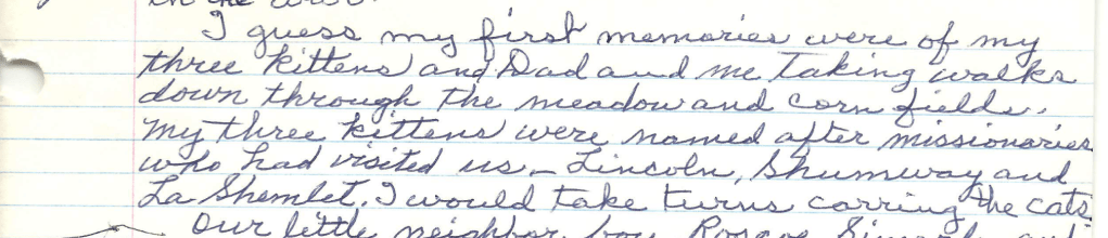 “I guess my first memories were of my three kittens and Dad and me taking walks down through the meadow and corn fields. My three kittens were named after missionaries who had visited us: Lincoln; Shumway; and La Shemlet. I would take turns carrying the cats…”