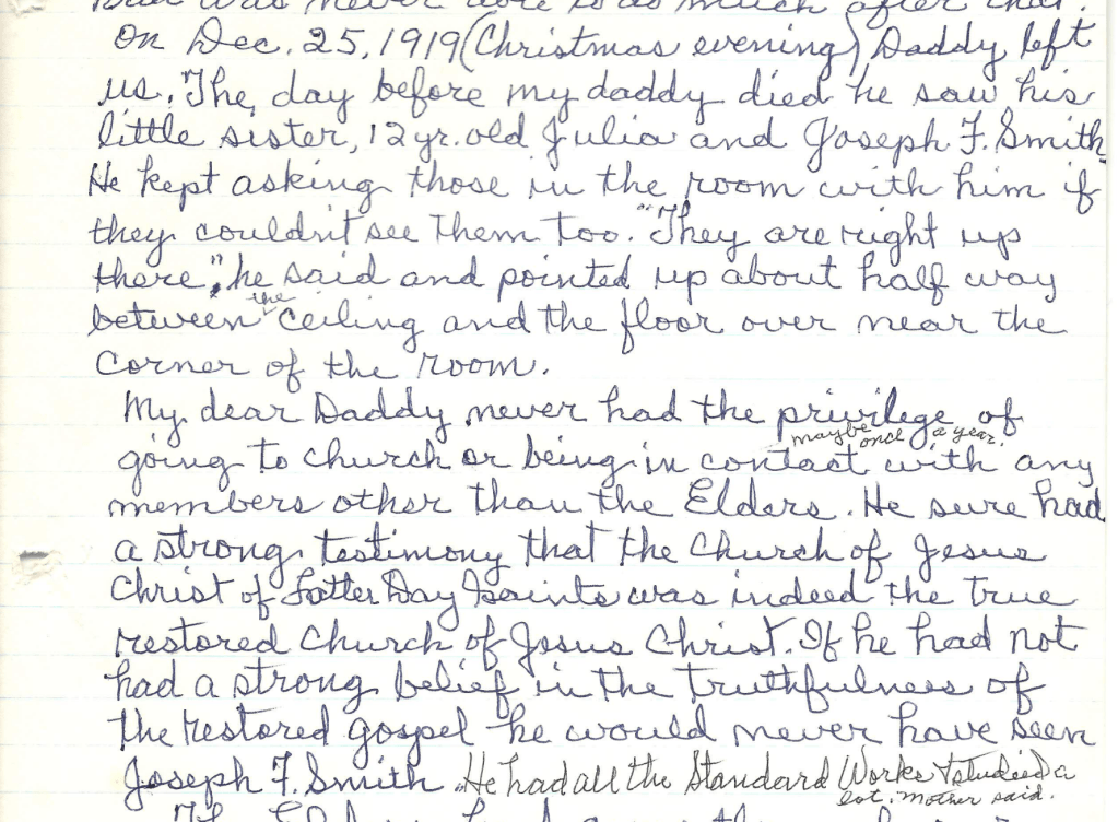 “On Dec[ember] 25, 1919 (Christmas evening) Daddy left us. The day before my daddy died, he saw his little sister, 12-y[ear]-old Julia, and Joseph F. Smith. He kept asking those in the room with him if they couldn’t see them too. “They are right up there,” he said, and pointed up about halfway between the ceiling and the floor over near the corner of the room.