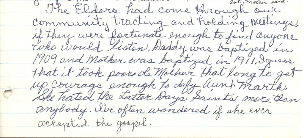 “The elders had come through our community tracting and holding meetings, if they were fortunate enough to find anyone who would listen. Daddy was baptized in 1909 and Mother was baptized in 1911. I guess that it took poor ‘ole Mother that long to get up courage enough to defy Aunt Marth. She hated the Latter-day Saints more than anybody. I’ve often wondered if she ever accepted the gospel.”