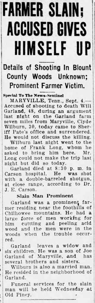 7. By 1939, there were 100 baptized members of the Church who had lived within the Smoky Mountain Ward boundaries. Sadly, three of them had been murdered by 1939. Statistically speaking, it could be said there was 3-percent chance of being killed as a member of the Church. Unfortunately, Will Garland was one of these members. How was Will Garland killed?