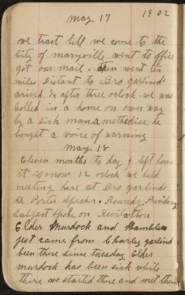[Sunday] – 18 May 1902 Eleven months today I left home. It is now 12 o’clock. We held meeting here at Bro[ther Joseph John (JC)] Garl[a]nd. A[binadi] Porter, speaker, [Othello] Roundy presiding. Subject: spoke on Revelation. Elder[s] [Alphonzo Brigham] Murdock and Hamblin just came from [William] Charley Garl[a]n[d]’s been there since Tuesday. Elder [Alphonzo Brigham] Murdock has been sick while there. We started there and met them. He says Mrs. [Elmyra Miller] Garl[a]n[d] is getting along alright. I will relate her cirumstance.