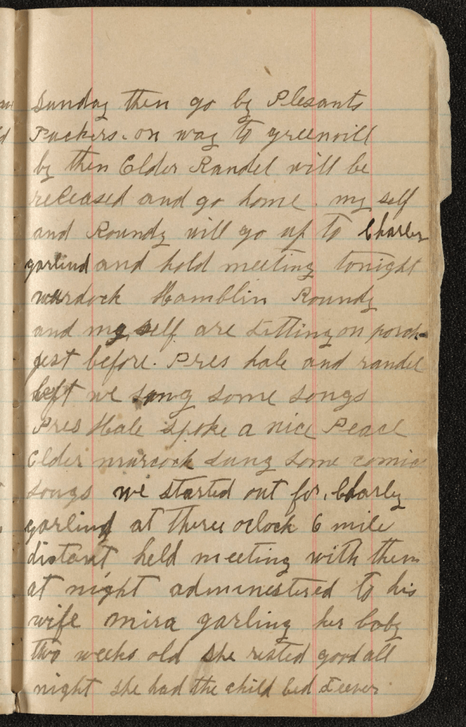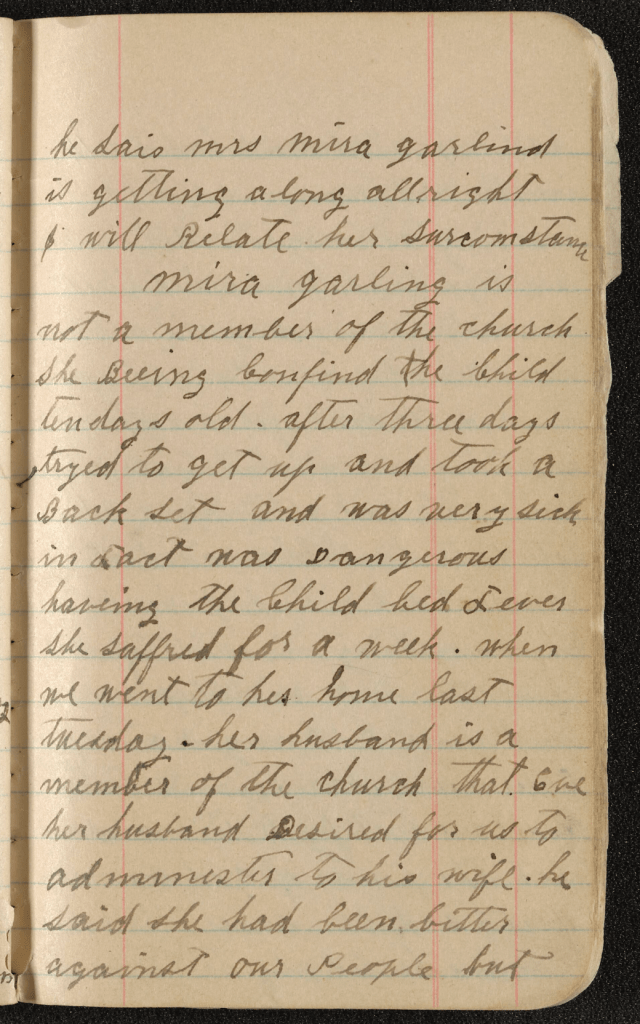 [El]m[y]ra [Miller] Garl[a]n[d] is not a member of the Church. She being confined, the child, [Charles Wesley Garland], being ten days old. After three days tried to get up and took a back set and was very sick. In fact was dangerous. Having the child [in] bed [with] fever, she had suffered for a week when we went to her home last Tuesday. Her husband, [William Charles Garland], is a member of the Church. That evening her husband desired for us to administer to his wife. He said she had been bitter against our people but had repented and had faith in the ordinance. We held meeting at night. After meeting we laid hands on her and blessed her, not having any oil with us. She rested good all night, which she hadn’t done for a week. Next morning we fasted, consecrated some oil and in the afternoon administered to her. Elder [Alphonzo Brigham] Murdock annointed her and I confirmed the annointing. In side of one hour the lady was sleeping and never felt any pain after. Elder [Alphonzo Brigham] Murdock remained there until Sunday and can testify to this and in the power of God was manifest and she says she knows she was healed by the power of God, and as soon as she gets well is going to get baptized into the Church with all her family. She has 14 children and only married 20 years. She had a dream two weeks ago, she saw in her dream her sickness and she saw a mist coming up before her. It came up until it reached her neck and it seemed as though it would smother her, but she said two Mormon Elders came and lifted up their hands, got their hands above the fog and pressed it down until she recovered.