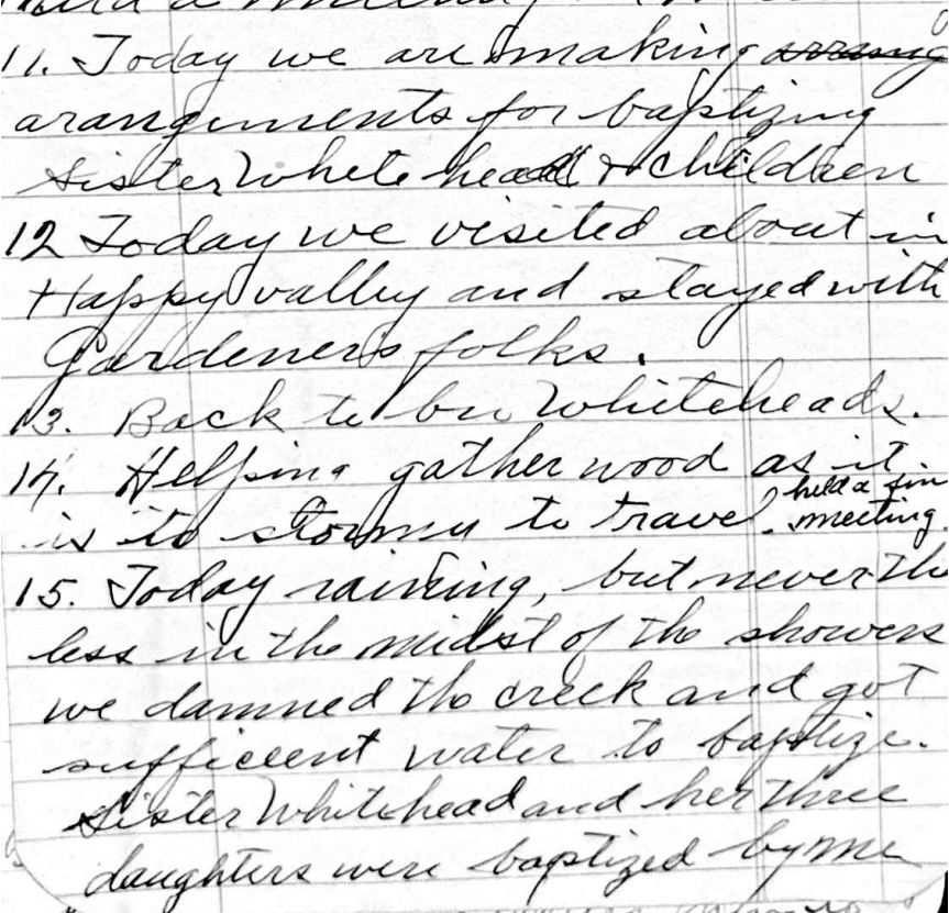[Wednesday] – 11 November [1914] Today, we are making arrangements for baptizing Sister [Mary Lucinda Teffeteller] Whitehead and children: [Stella May Whitehead, Rhoda Anna Whitehead, and Cora Elverta Whitehead].