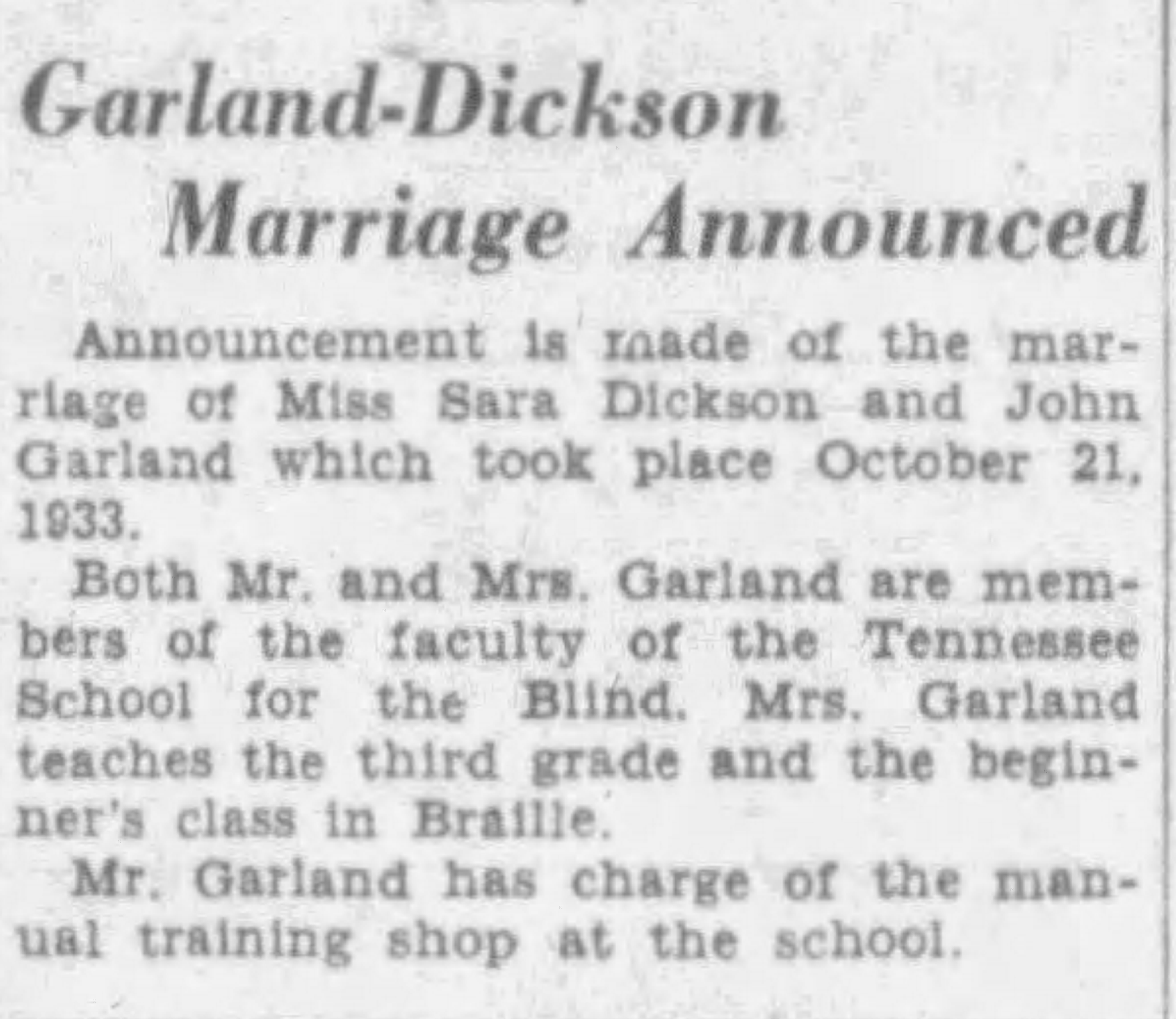 JP Garland and Sarah Dixon married in 1920. John died in 1953, at the age of 62. Sarah died in 1961, at the age of 67. They are both buried in the Spring Hill Cemetery in Nashville. His obituary published in Nashville identified him as a member of The Church of Jesus Christ of Latter-day Saints.