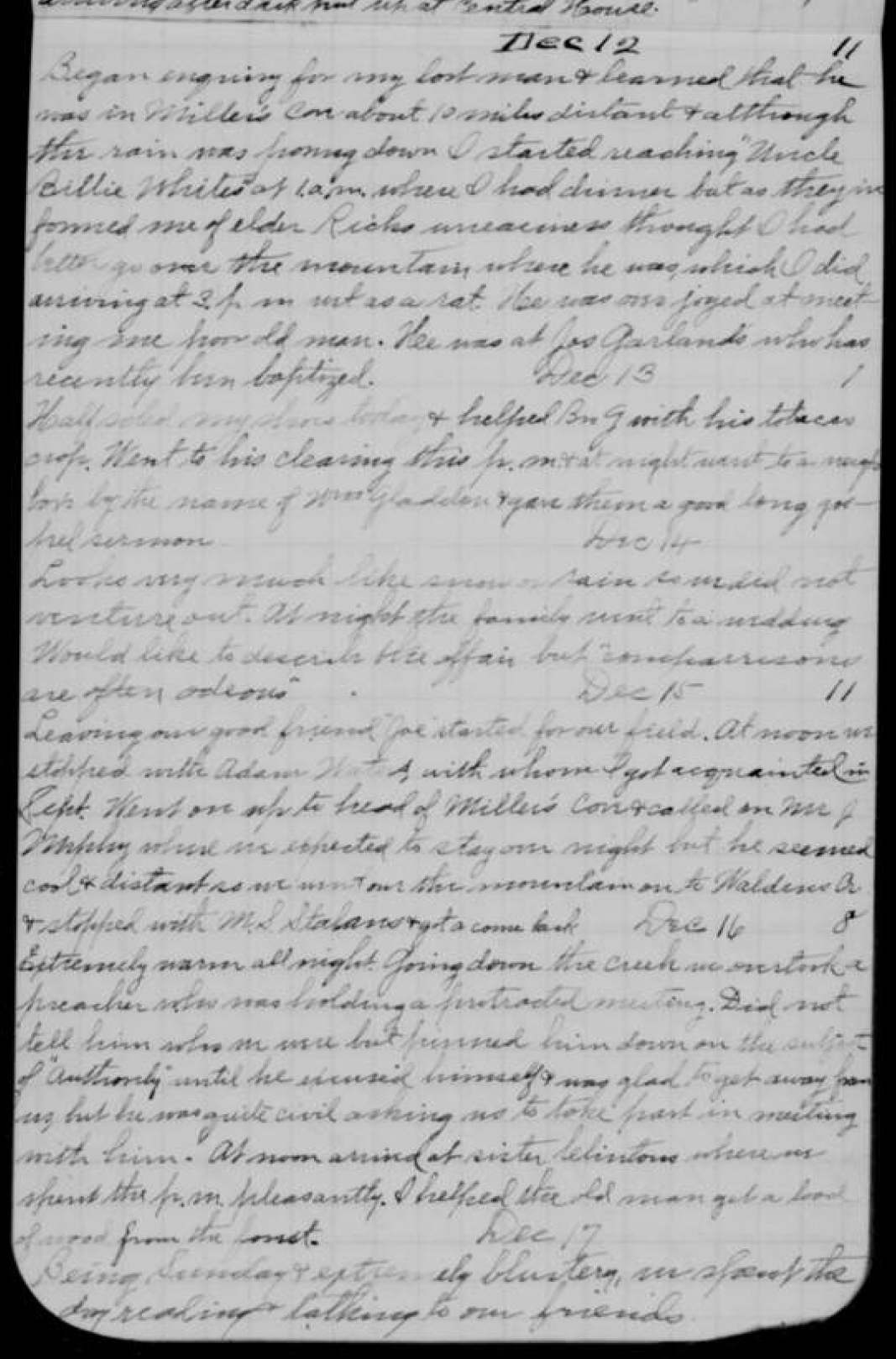 [Tuesday] – 12 December [1893] Began inquiring for my lost man [Elder William Ricks] and learned that he was in Millers Cove about 10 miles distance and, although the rain was coming down, I started reaching “Uncle Billie White’s” at 1 AM (sic), where I had dinner but as they informed me of Elder [William] Ricks’ uneasiness, thought I had better go over the mountain where he was, which I did. Arriving at 3 PM wet as a rat. He was at Jos[eph John Calvin (JC)] Garlands who has recently been baptized.