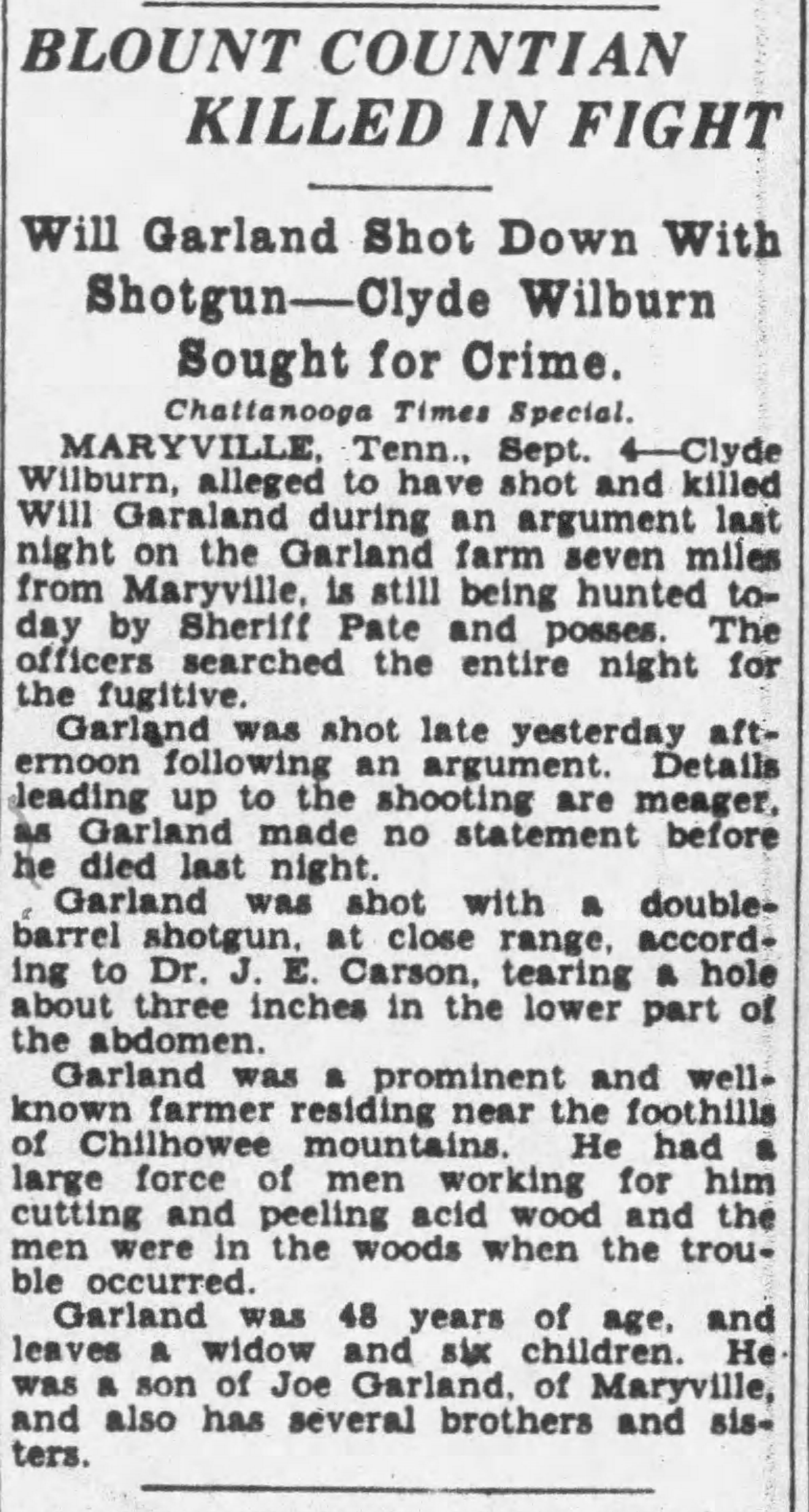 I was sent back to my father’s home in Maryville. Samantha had her hands full take care of her own, with six children of her own and pregnant with a yet unborn. My father [Joseph John Calvin (JC) Garland] then told of Will’s death, looked off into space and said, ‘It’s a long road and it has no end.’ [My] father [Joseph John Calvin (JC) Garland] died a month later.