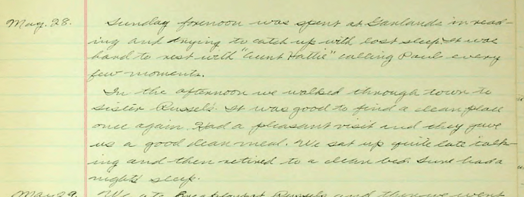 [Sunday] – 28 May [1922] Sunday forenoon was spent at [Joseph John Calvin (JC)] Garland’s in reading and trying to catch up with lost sleep. It was hard to rest with “Aunt Hattie” [Jane Gentry] calling Paul [Ezekiel Garland] every few moments. In the afternoon we walked through town to Sister [Martha Lane] Russell’s. It was good to find a clean place once again. Had a pleasant visit and they gave us a good clean meal. We sat up quite late talking and then returned to a clean bed. Sure had a night’s sleep.
