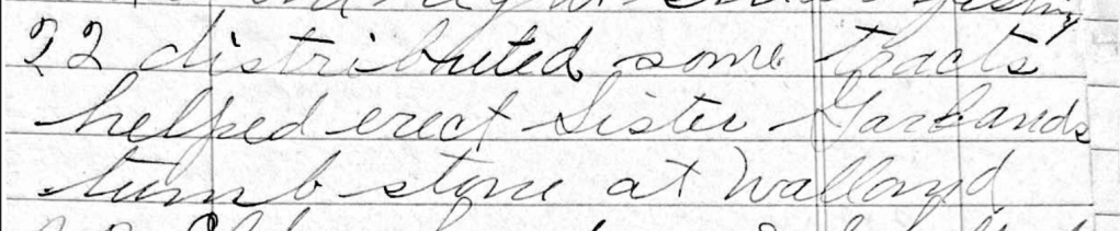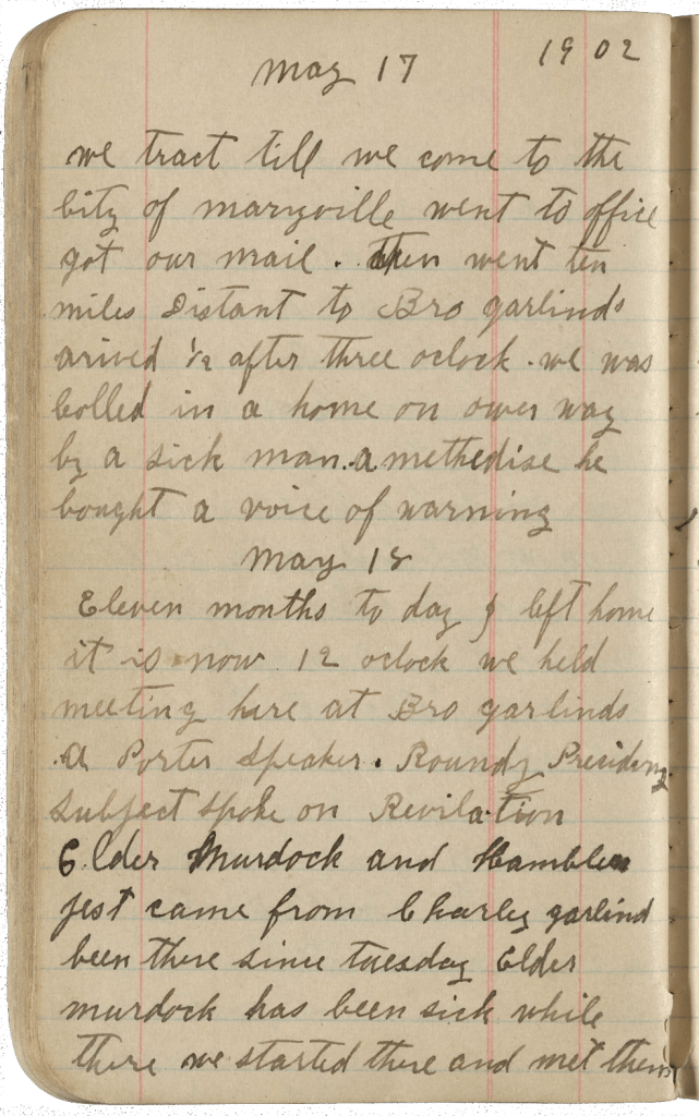 [Tuesday] – 8 July 1902 Elder[s Claudius Eugene] Hawk[e]s, [Thomas] Lawrence and [Melvin Parley] Miller and myself left Bro[ther Joseph John Calvin (JC)] Garl[a]nd’s about 9 o’clock after administering to his mother, [Eliza Jane Nelson]. Went till (sic) we came to a sick man by [the] name of Burns. He wanted us to administer to him. He said he had faith in the ordinance. After, went to Marysville (sic), received a letter from my wife and Bishop Inglestrom. Arrived to the home of W[illia]m Ward. Stopped overnight. Walked 18 miles.