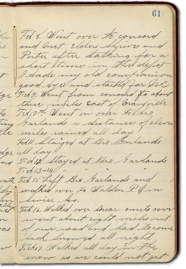 Saturday – 6 [January 1894] To Millers Cove. I feel all right this morning. We called on a few persons and then decided we had finished the co[ve]. James Waters asked us to have dinner with him and of course we never refuse. Started for Bro[ther Joseph John Calvin (JC)] Garland’s about 7:30. Got there about 6 PM. Found all [is] well. 11 [miles]