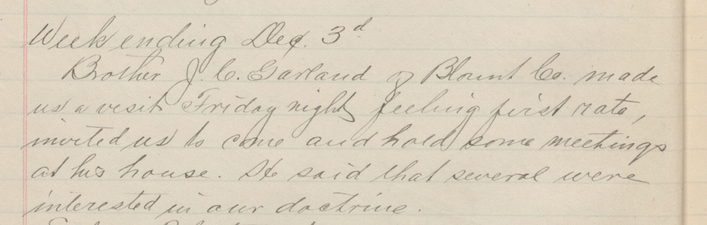 In 1922, Elder Thomas Gibby was serving in Blount County and documented a day with William Garland in the following journal entry: