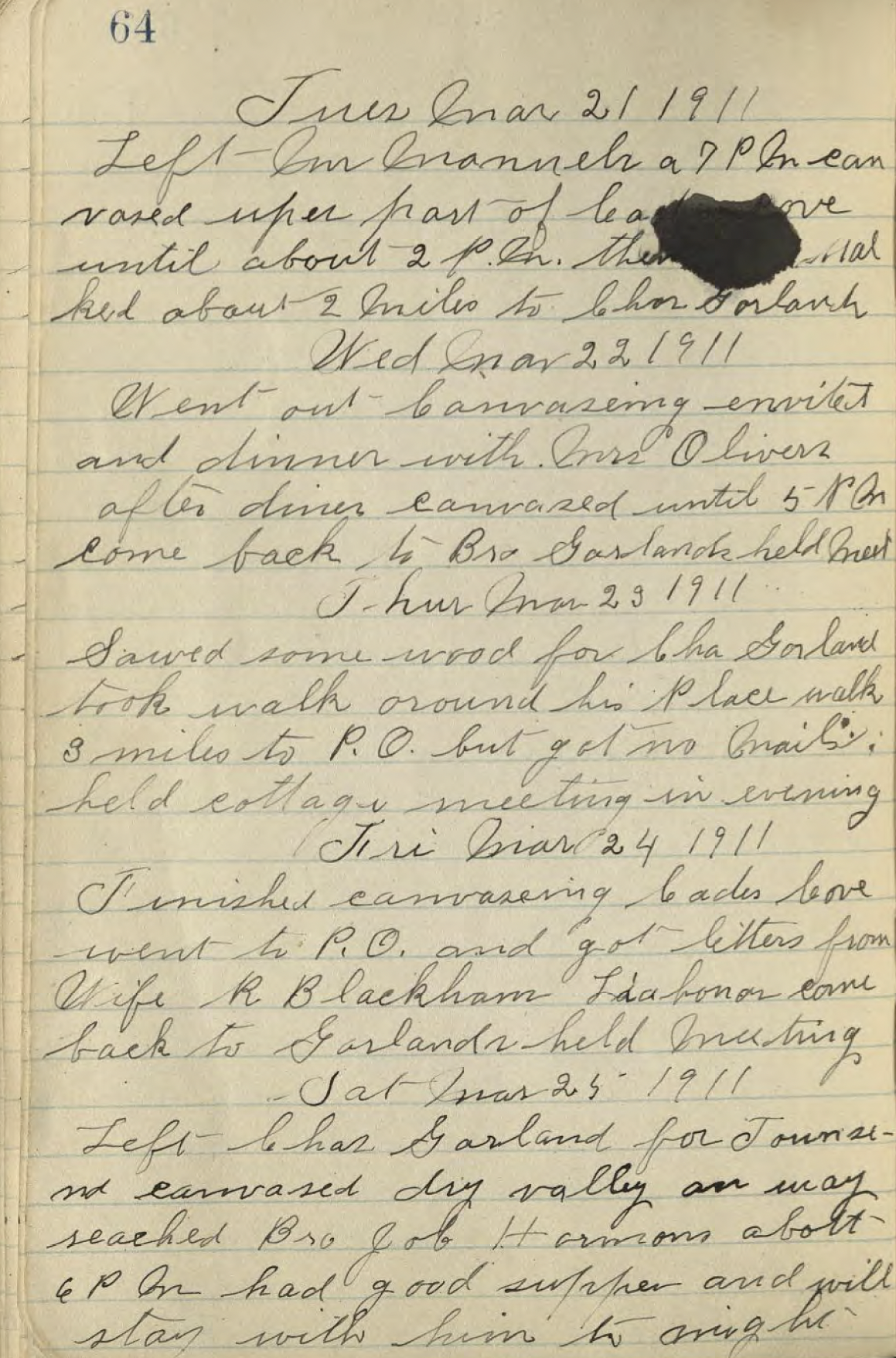 Wed[nesday] – 22 Mar[ch] 1911 Went out canvassing. Invited and dinner with Mr. Oliver. After dinner canvassed until 5 PM. Come back to Bro[ther William Charles] Garland’s, held meet[ing].