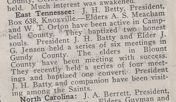 By 1911, the missionaries were regularly visiting Charlie and Elmyra after they had moved from Beard Cane to Cades Cove. Elder John Isaac Morley briefly documented some of these visits during his short time laboring in Blount County in the following journal entries of 1911: