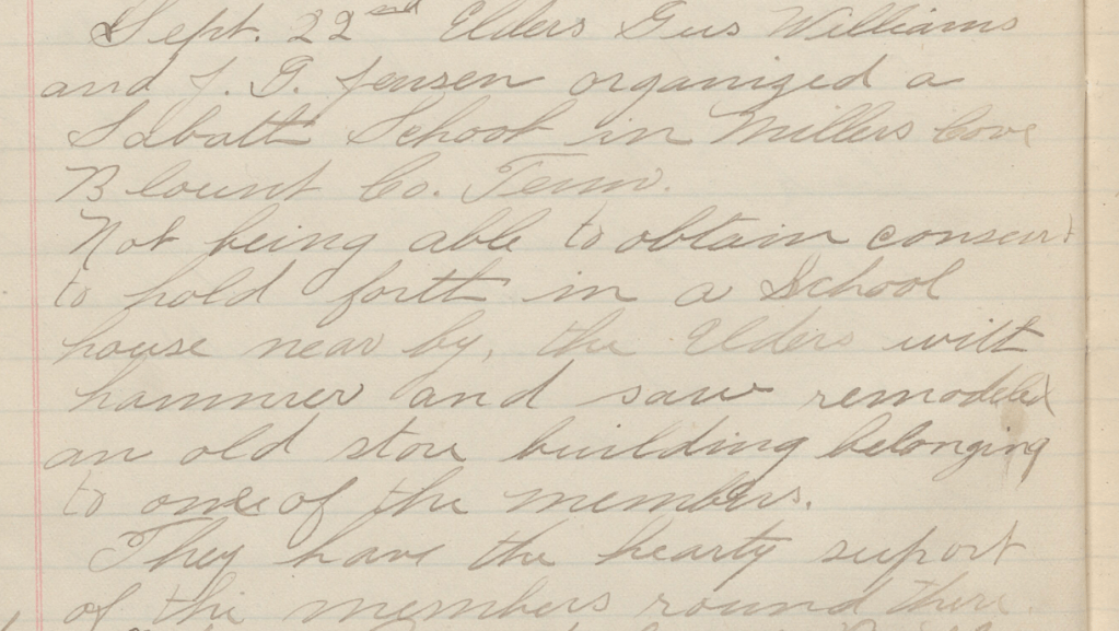 “22 Sept[ember 1907] Elders Gus[tavious] Williams and J[orgen] G[eorge] Jensen organized a Sabbath School in [West] Millers Cove, Blount Co[unty], Tenn[essee]. Not being able to obtain consent to hold forth in a schoolhouse nearby, the Elders, with hammer and saw, remodeled an old store building belonging to one of the members. They have the hearty support of the members [a]round them.“