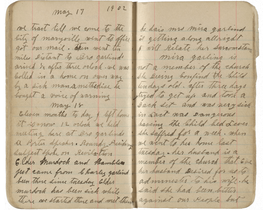 [Sunday] – 18 May 1902 Eleven months today I left home. It is now 12 o’clock. We held meeting here at Bro[ther Joseph John (JC)] Garl[a]nd. A[binadi] Porter, speaker, [Othello] Roundy presiding. Subject: spoke on Revelation. Elder[s] [Alphonzo Brigham] Murdock and Hamblin just came from [William] Charley Garl[a]n[d]’s been there since Tuesday. Elder [Alphonzo Brigham] Murdock has been sick while there. We started there and met them. He says Mrs. [Elmyra Miller] Garl[a]n[d] is getting along alright. I will relate her circumstance. [El]m[y]ra [Miller] Garl[a]n[d] is not a member of the Church. She being confined, the child, [Charles Wesley Garland], being ten days old. After three days, [she] tried to get up and took a back set and was very sick. In fact [it] was dangerous. Having the child [in] bed [with] fever, she had suffered for a week when we went to her home last Tuesday. Her husband, [William Charles Garland], is a member of the Church. That evening her husband desired for us to administer to his wife. He said she had been bitter against our people but …