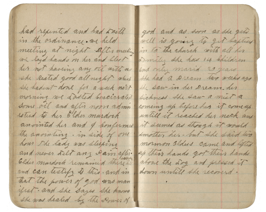 …had repented and had faith in the ordinance. We held [a] meeting at night. After [the] meeting, we laid hands on her and blessed her, not having any oil with us. She rested good all night, which she hadn’t done for a week. Next morning we fasted, consecrated some oil and in the afternoon administered to her. Elder [Alphonzo Brigham] Murdock anointed her and I confirmed the anointing. Inside of one hour, the lady was sleeping and never felt any pain after. Elder [Alphonzo Brigham] Murdock remained there until Sunday and can testify to this and in the power of God was manifest and she says she knows she was healed by the power of God, and as soon as she gets well is going to get baptized into the Church with all her family. She has 14 children and only married 20 years. She had a dream two weeks ago, she saw in her dream her sickness and she saw a mist coming up before her. It came up until it reached her neck and it seemed as though it would smother her, but she said two Mormon Elders came and lifted up their hands, got their hands above the fog and pressed it down until she recovered.