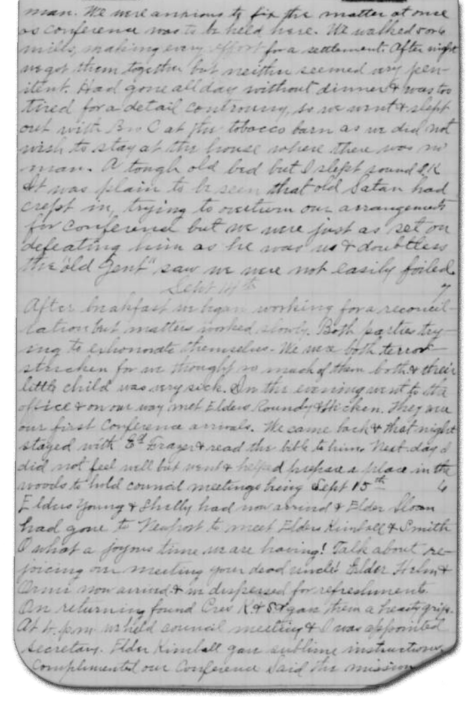 [Friday] – 15 September [1893] Elders [Robert Cunningham Young] and [Leo Thomas] Shelley had now arrived and Elder [Thomas Watts] Sloan had gone to Newport to meet Elders [J. Golden] Kimball and [George Alma] Smith. O what a joyous time we are having! Talk about rejoicing over meeting your dead uncle! Elders [Andrew D.] Helm and [Thomas Cross] Orme now arrived and we dispersed for refreshments. On returning, we held council meeting and I was appointed secretary. Elder [J. Golden] Kimball gave sublime instructions, complimented our conference. [He] said the mission [is] getting on a higher platform and would now be carried to the cities and even to the halls of Congress. God will cut his work short in righteousness. [He] urged us on the necessity of appearing neat and clean. Go before the world fearless and in the majesty of the Holy Priesthood. Where you are tossed out give the Lord thanks, for He was also despised. Companions must not separate from each other. Go without purse or scrip, depending on the Lord. He will bless you. Be thorough in reporting up each week and, if one gets sick, let it be known at once. Any elder can get a release by asking for it. Sing only gospel songs. Refrain from becoming familiar with friends out here. Satan is on the alert and may beguile you. Be prayerful and exercise faith in God. After the world has heard the testimony of the elders, then will come the testimonies of famine, war and destruction. Be greatful (sic) for every kindness shown you, and the Lord will open your way. Don’t urge anyone to get baptized. Organize local branches if possible. Teach the saints to pray and how to properly conduct themselves, and a thousand other good points were given. In the evening Elders [J. Golden] Kimball and [George Alma] Smith, [Thomas Watts] Sloan and myself staid (sic) at Bro[ther] Cook’s, and as Elder [J. Golden] K[imball] had saw Sister Cook at Newport ready to leave, and had indeed [illegible] her to return, he got she and Bro[ther] C[ook] together and gave them the grandest talking to I ever listened to, so kind and fatherly. We held five council meetings in all.