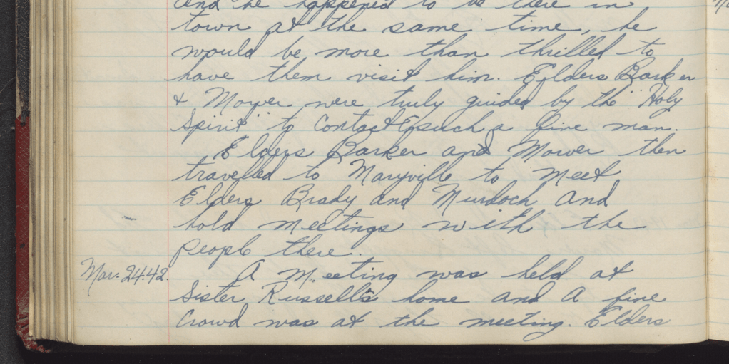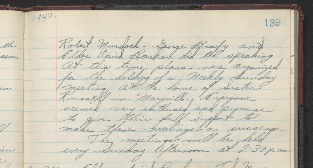 “March 24, [1942] A meeting was held at Sister [Martha Elizabeth Lane] Russell‘s home and a fine crowd was at the meting. Elders Robert [Gail] Murdoch, George [Wilbur] Brady and Elder David [William] Barker did the speaking. At this time, plans were organized for the holding of a weekly Sunday meeting at the home of Sister [Martha Lane] Russell in Maryville. Everyone seemed very enthused and promise to give their full support to make these meetings a success. The meeting will be held every Sunday afternoon at 2:30 pm.”