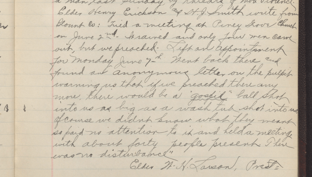 Elder [George] Henry Erickson and H[eber] J[ohn] Smith write from Blount Co[unty]: Tried a meeting at Pine Grove Church on June 2nd [1909]. It rained and only four men cam with, but we preached. Left an appointment for Monday, June 7th. Went back there and found an anonymous letter on the pulpit warning us that if we preached there any more, there would be a ‘gospel’ ball shot into us as big as a wash tub shot into us. Of course, we didn’t know what they meant, so [we] paid no attention to it and held a meeting with about forty people present. There ‘was no disturbance.’