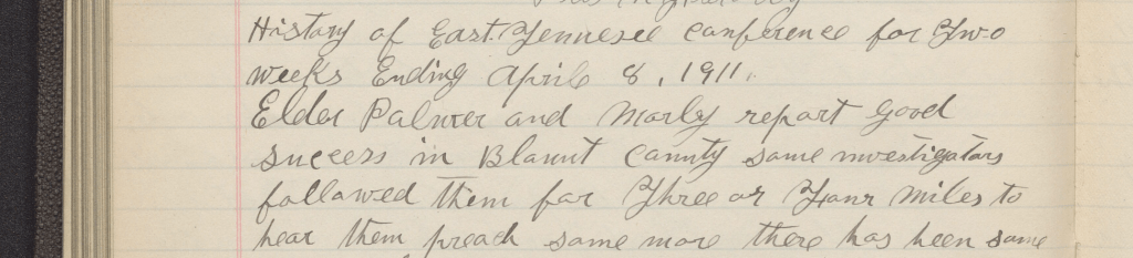 “History of [the] East Tennessee Conference for two weeks ending April 8, 1911. Elder [Heber Ewer] Palmer and [John Isaac] Morley report good success in Blount County. Some investigators followed them for three or four miles to hear them preach some more…”