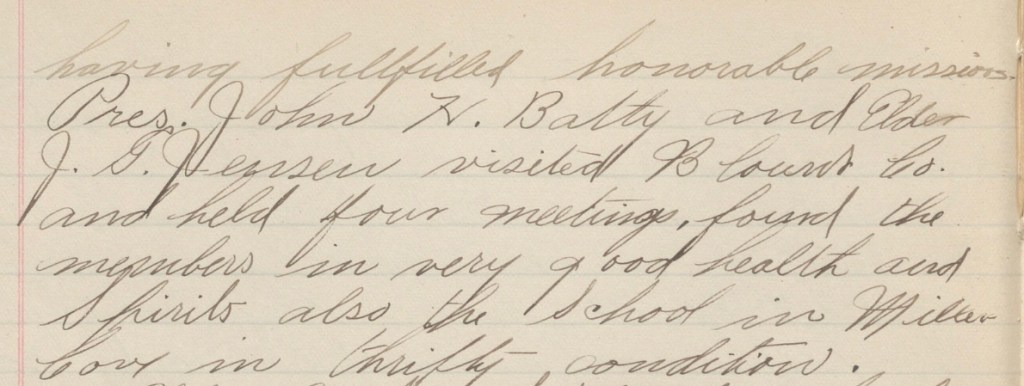 “[March 1907] Pres[ident] John H. Batty and Elder J[orgen] G[eorge] Jensen visited Blount Co[unty] and held four meetings, found the members in very good health and spirits, also the [Sunday] School in [West] Millers Cove in thrifty condition.“