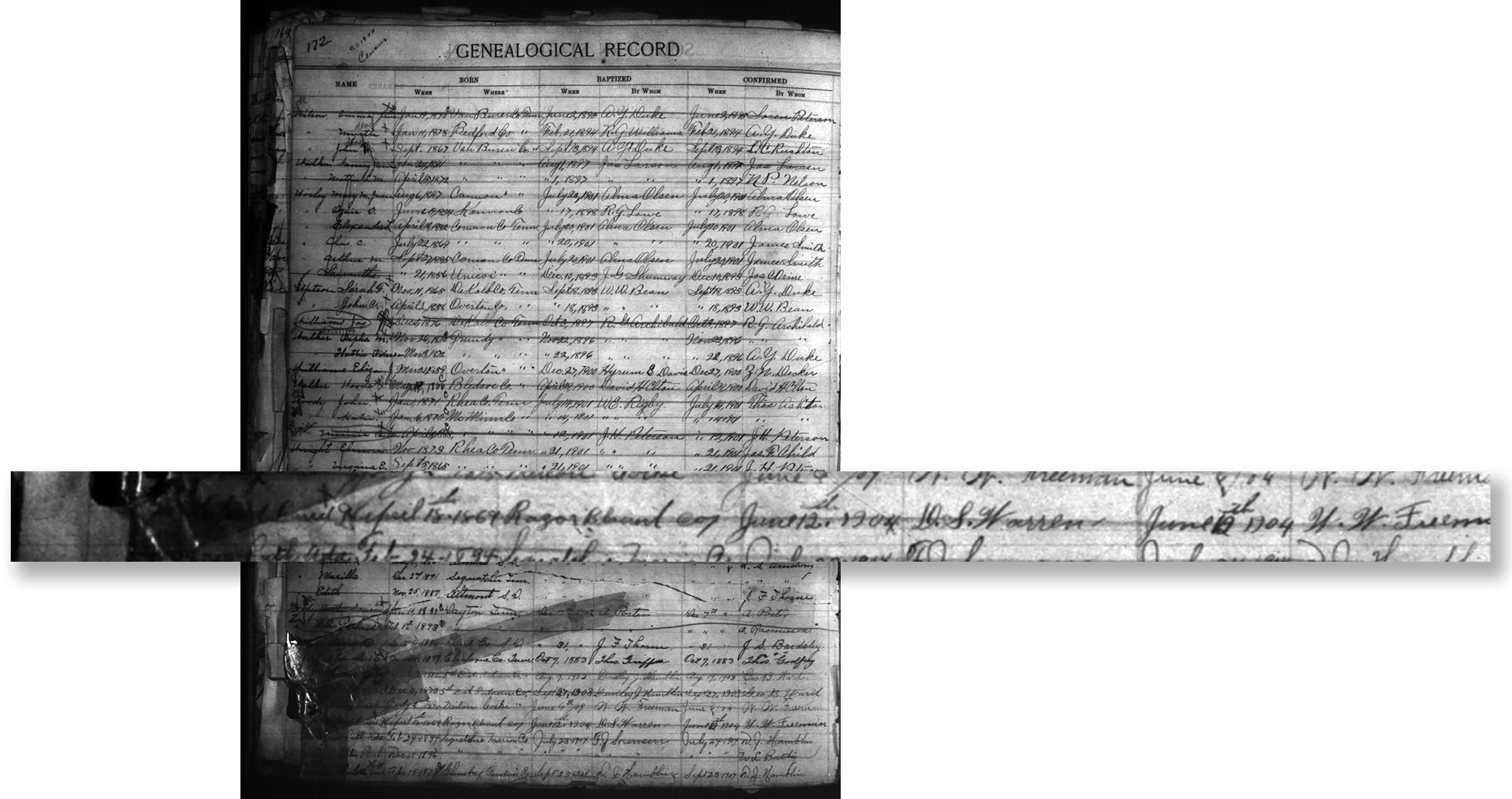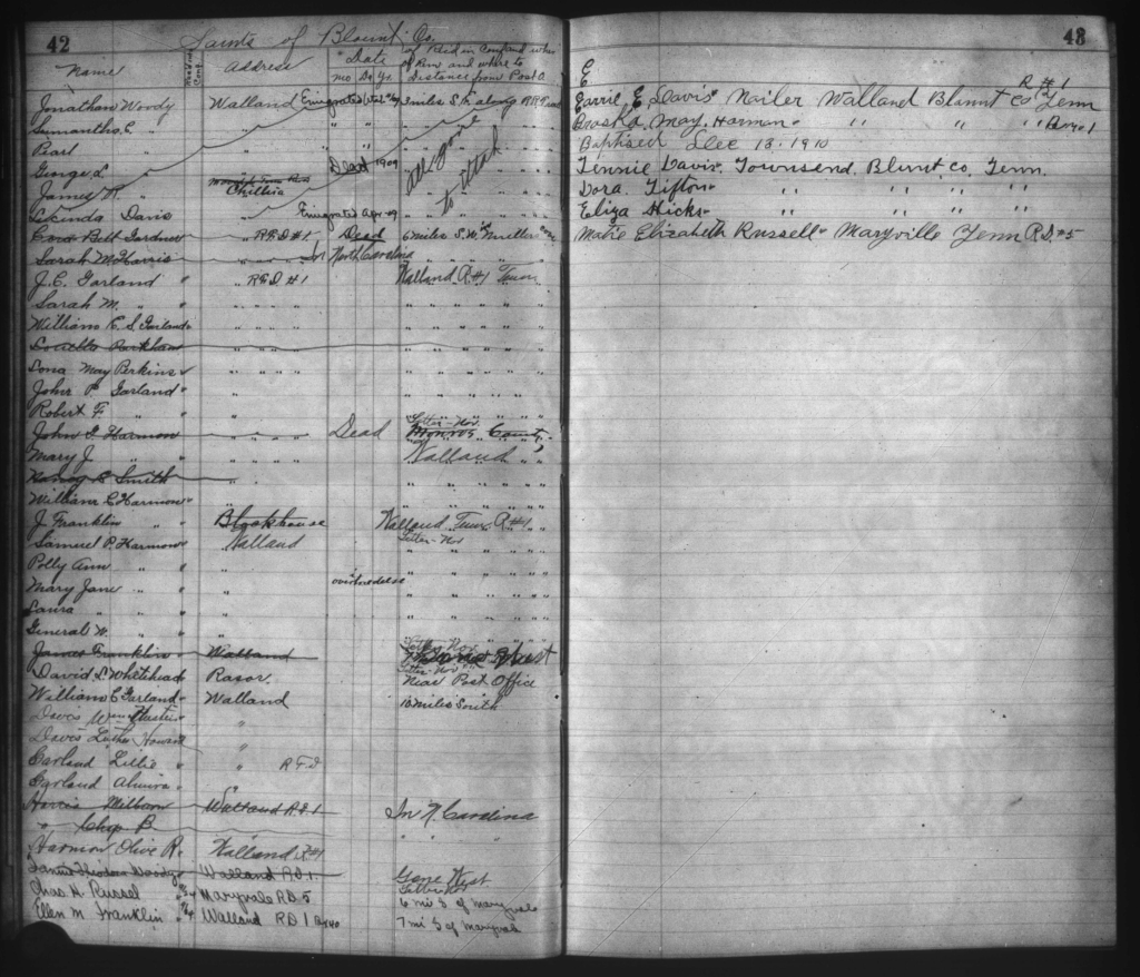 The Church of Jesus Christ of Latter-day Saints maintains early records in digital format of the Southern States Mission, which at the time the Knoxville Stake History was written, was only available in microfiche. I marvel that the stake history was so well-researched with such limited tools for the time. These records are now available in Family History Centers and by personal requests for various Church Collections online. I made requests and began reviewing thousands of Church records that contain baptismal data, children’s blessings, ordinations to the priesthood, and missionary ledgers. Thirteen journals have also been discovered that provided additional names not found in official Church records. I maintained a spreadsheet and documented every baptism and confirmation that occurred in Blount County, more specifically within our ward boundary. Slowly, the spreadsheet began to fill in with dates, locations, and initials of those who were baptized and confirmed. The missionaries who performed the ordinances were also identified with partial names. Thanks to their inspired dedication recording genealogical data, this process of identifying people was made possible.